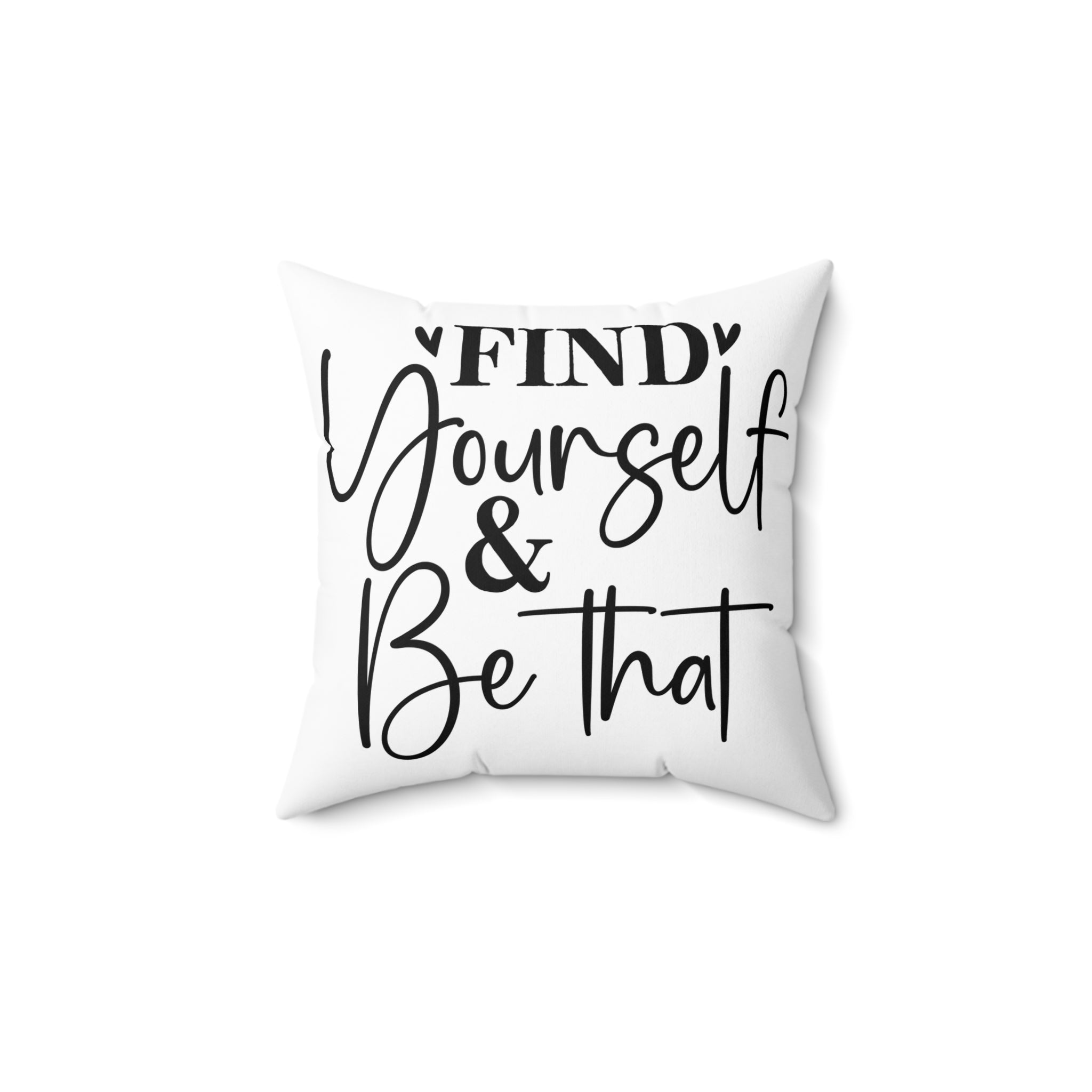 Add a touch of inspiration to your space with our elegant white throw pillow, featuring an uplifting phrase, "Find Yourself And Be That." This pillow offers both style and comfort. The minimalist black script against the crisp white background makes it a versatile accent piece that compliments any decor, whether on a sofa, bed, or your favorite chair. It's perfect for adding a positive, motivational vibe. This pillow reminds you to just be your authentic you. Just choose the size you want.