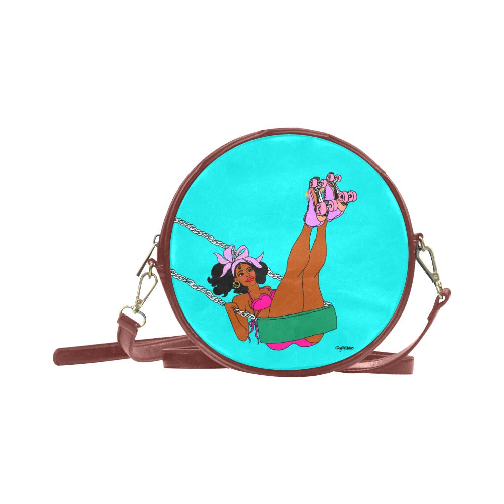 This messenger bag features an original illustration of a "Swinging Hottie," on one side, and has a single zippered round closure. There is a single zipper opening and closing. It features one main compartment, big enough to pack cosmetics, sunglasses, or a cellphone. There is also an adjustable shoulder strap for easy and comfortable carrying. You can also use it for shopping and travel.
